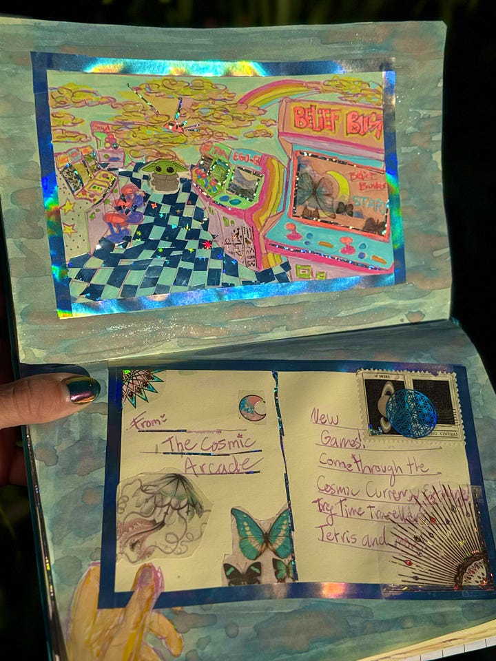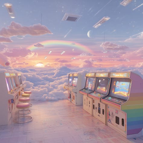 The arcade seems to go on endlessly with flashing lights and hums of colliding melodies. The ceiling extends into day and night skies like blended polarities. They could only access the arcade going through The Cosmic Currency Exchange, which helps secure that no one accesses the games in vain. They brush by the Placebo Effect Crane Gotcha Game. Her Dad was nervous at first, but now feels much more sane. Susie had a great time getting in, and says she’s, “so excited ~she doesn’t even know how to explain.”