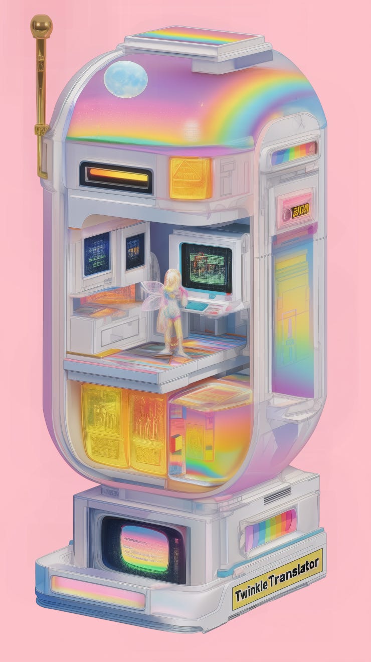 From the outside, one can adjust all sorts of settings, pick up cosmic calls, tune to particular channels or photonic radio stations, but all that’s only possible because Phoebee, is the middleman inside, sorting through all spectrums of light. There’s significantly more than humans can see with their eyes. The Twinkle Translator can even capture varieties of light that appear like darkness as an elaborate disguise. Of course, there’s always interest in conversations amongst constellations or latest word from the sunrise.